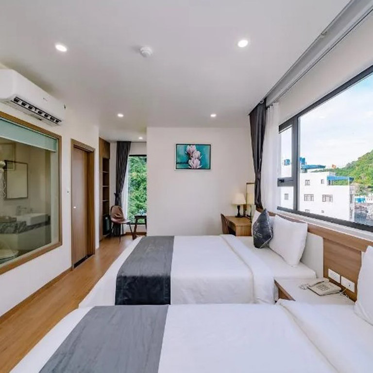 - Phòng đôi tiêu chuẩn: Diện tích khoảng 40m2 với view hướng biển. Có 2 giường đôi và sức chứa tối đa 4 người.