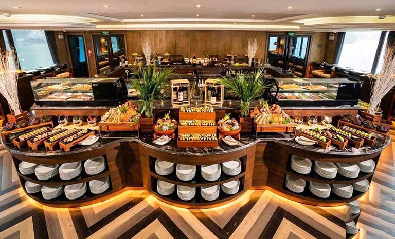 – 19h15 – 19h30: Du thuyền đến điểm neo đậu. Sau đó quý khách thưởng thức bữa tối buffet hảo hạng trên du thuyền.