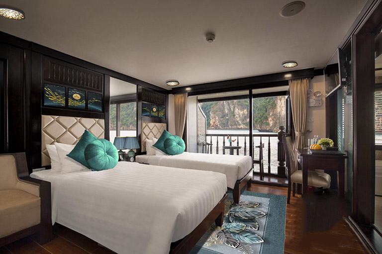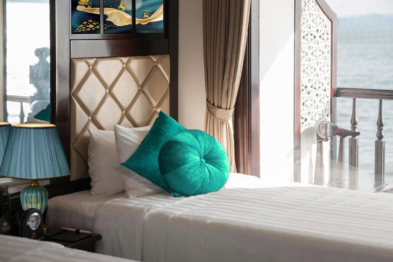Du thuyền Alisa Premier Cruise sở hữu tất cả 22 phòng riêng biệt, có ban công riêng và bồn tắm Jacuzzi siêu thoải mái. Tone màu chính được sử dụng là màu trắng của giường, chăn ga gối hoà quyện với màu nâu trầm của sàn gỗ. Bên cạnh đó không thể thiếu sự điểm xuyến của các chi tiết khác như tranh treo tường, thảm trải sàn,… càng tôn lên vẻ đẹp tinh tế.