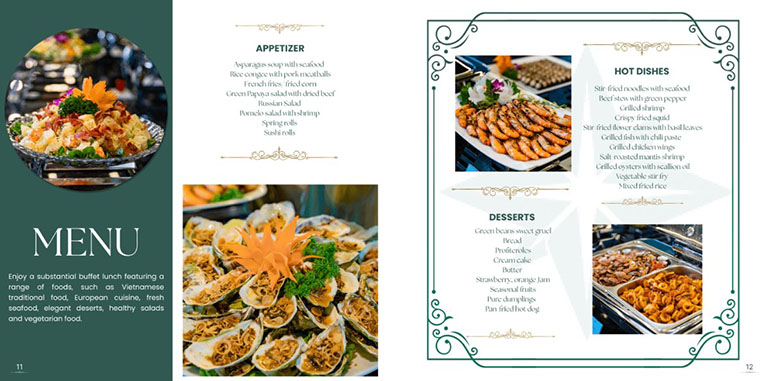 Quý khách được thưởng thức các món ăn hấp dẫn nhất, đa dạng, tinh tế từ món tráng miệng, salad, đồ hải sản tươi ngon, món ăn chay,… do những đầu bếp nhiều kinh nghiệm thực hiện.