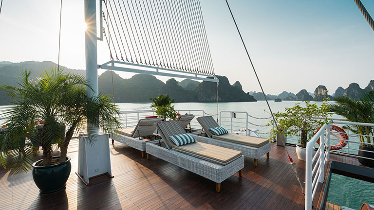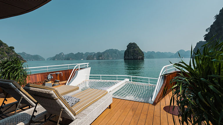 Sundeck trên du thuyền là điểm đến có sức mê hoặc nhất với tất cả du khách. Đặc biệt trên du thuyền Catamaran, bạn thoải mái check-in sống ảo nhờ thiết kế cầu kỳ, bắt mắt. Phần thiết bị đều là loại cao cấp kết hợp với chất liệu truyền thống địa phương mang đến background thực sự ấn tượng. Nhờ đó quý khách sẽ có giây phút tụ tập bên người thân, bạn bè rất đáng nhớ.