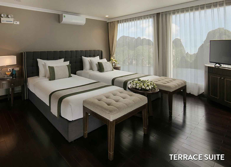 Phòng Terrace Suite có số lượng 6 phòng, trong đó 4 phòng tầng 1 và 2 phòng tầng 2. Diện tích phòng khoảng 47m2, gồm 2 giường đơn hoặc 1 giường lớn. Ban công riêng rộng 9m. Phòng tắm đứng và có bồn tắm. Số lượng người: 02 người lớn + 1 trẻ dưới 12 tuổi. Hạng phòng này thích hợp với các gia đình hoặc nhóm bạn bè với ngân sách hạn chế. Tuy nhiên bạn vẫn thoải mái sử dụng sân hiên phơi nắng riêng tư. Phòng tắm riêng trang bị đầy đủ vòi hoa sen tắm đứng, bồn tắm bể sục,…