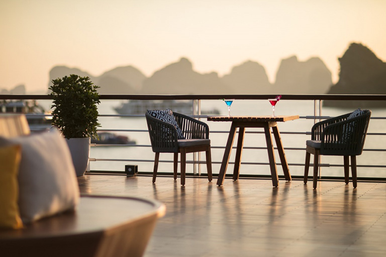 Sảnh ngoài trời được thiết kế với không gian mở thoải mái cho bạn ngắm bình minh hay hoàng hôn. Nó nằm ở phần đuôi tàu tiếp nối với nhà hàng Nhà hàng L’Indochine.