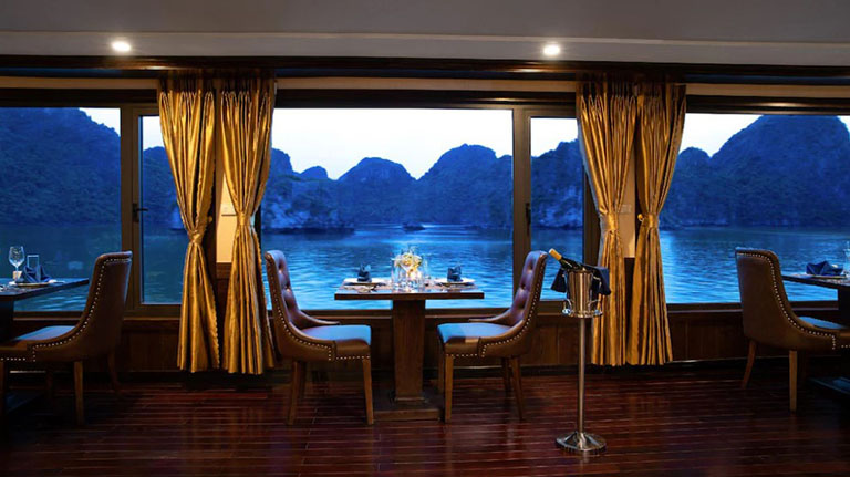 – 19h00: Quý khách dùng bữa tối tại nhà hàng của du thuyển với những món ăn được chế biến một cách cầu kỳ và tinh tế của đầu bếp.
