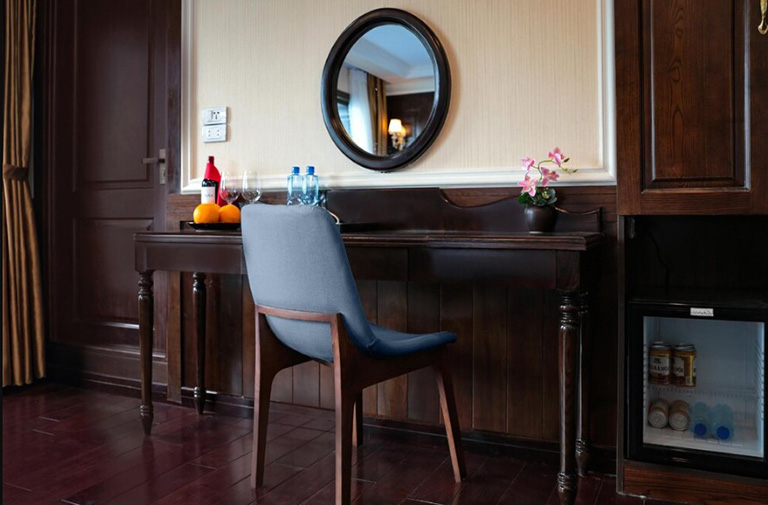 Phòng nghỉ trên du thuyền La Pandora là sự kết hợp hài hoà giữa 2 sắc màu tương phản- màu trắng của giường, chăn ga gối với màu nâu của sàn gỗ, các đồ nội thất xung quanh. Bên cạnh đó, nhờ điểm thêm các chi tiết như bàn ghế, đèn ngủ,… càng làm cho không gian thêm hài hoà, sang trọng, tinh tế.