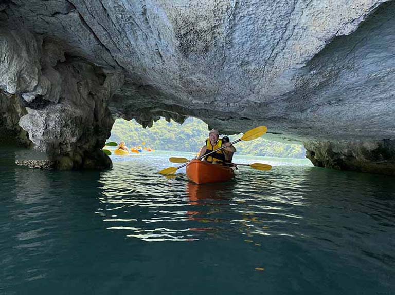 – 14h00: Quý khách đến khu vực Ông Cậm của vịnh Lan Hạ. Bạn có thể thoải mái chèo thuyền kayak hoặc bơi lội tự do trong vùng biển xanh trong.
