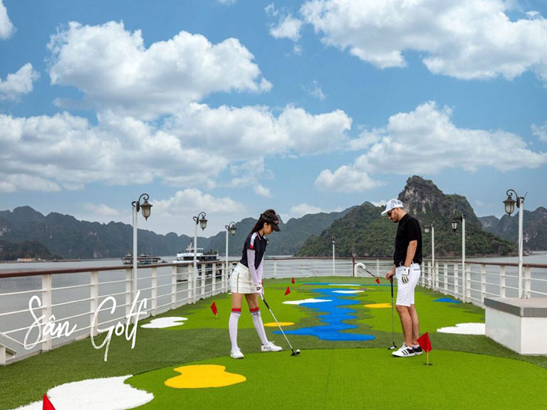 Đặc biệt trên du thuyền Mon Cheri có sân golf mini với góc nhìn 360 độ đẳng cấp. Bạn vừa chơi golf, vừa ngắm cảnh đẹp ở mọi góc nhìn.