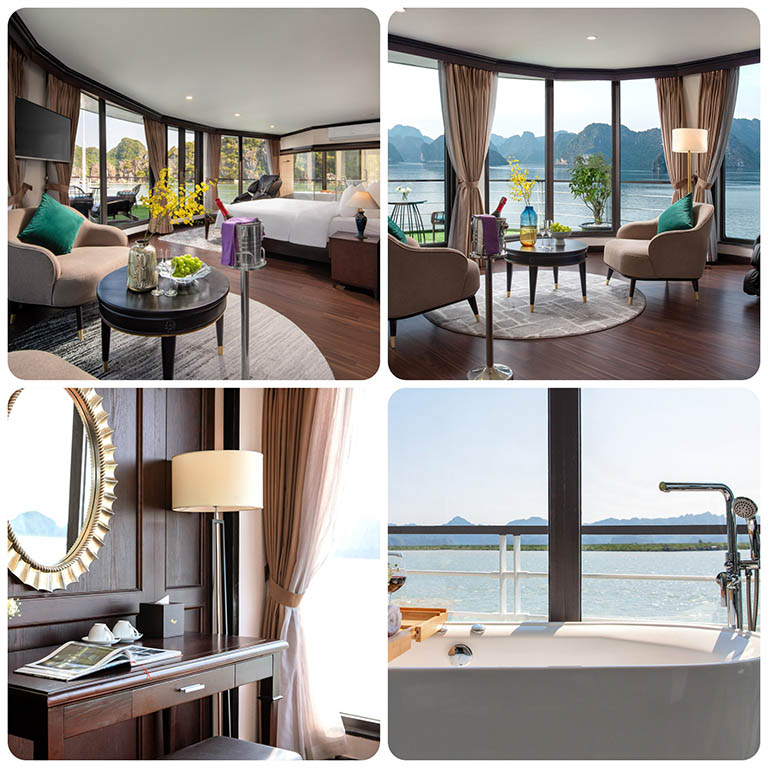 – Phòng Elegance Suite Triple Balcony: Nằm ở boong thứ ba của du thuyền, rộng khoảng 45m2, bao gồm 1 giường đôi lớn hoặc 2 giường đơn. Ban công riêng, kết nối với phòng tắm riêng và nhìn ra biển, cả vòi sen vách kính và bồn tắm đều được trang bị các tiện nghi thư giãn.