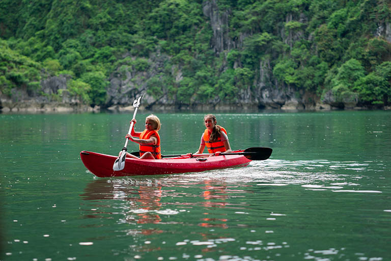 – 12h15: Quý khách trở lại du thuyền và thưởng thức bữa trưa tại nhà hàng, trong khi thuyền di chuyển đến điểm chèo thuyền kayak và bơi lội.