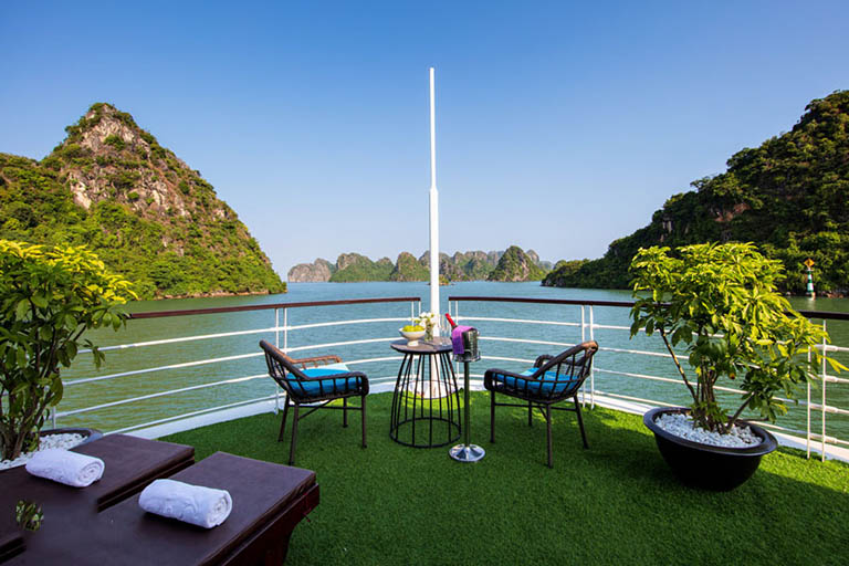 – 16h30: Quý khách quay trở lại du thuyền thư giãn, ngâm mình trong bể sục mini Jacuzzi. Hoặc thưởng thức đồ ăn, thức uống và âm nhạc bên hồ bơi.