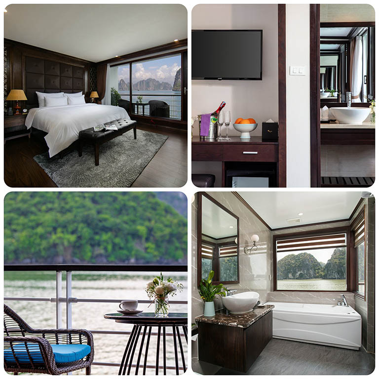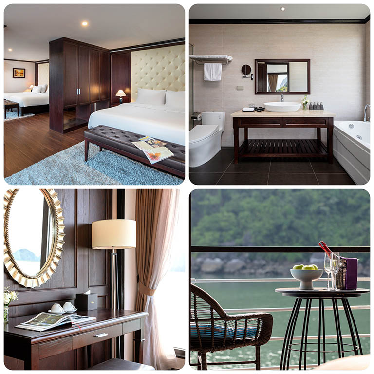 – Phòng Ocean Suite Balcony Triple: Nằm ở boong thứ hai của du thuyền, rộng khoảng 40m2, có 2 giường đơn hoặc 1 giường đôi. Phòng tắm riêng được trang bị tinh tế với góc tắm vòi sen đứng, đồ vệ sinh cá nhân cao cấp.