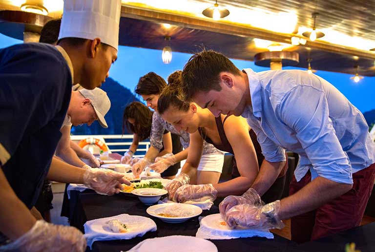 – 18h00: Quý khách tham gia chương trình dạy nấu ăn do bếp trưởng của du thuyền hướng dẫn với cách làm những món ăn truyền thống như nem rán.