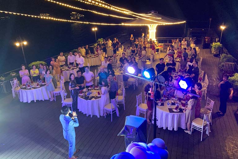 – 19h00: Quý khách dùng bữa tối tại nhà hàng trong không gian lãng mạn, huyền ảo. Sau đó, mọi người tham gia các hoạt động giải trí như xem phim, hát karaoke, chơi bài,…