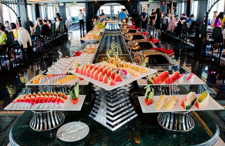 Nhà hàng và quầy bar trên du thuyền được thiết kế theo phong cách châu Âu sang trọng và ấm áp. Nhờ đó bạn có thể thoải mái thưởng thức đủ món ăn hấp dẫn từ châu Á đến châu Âu, món ăn địa phương. Từ trong phòng, mọi người phóng tầm mắt ra xa là bao quát được toàn bộ cảnh đẹp của vịnh Lan Hạ.