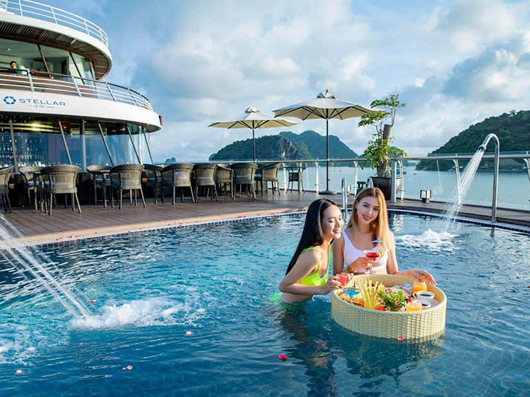 – Bể bơi bốn mùa, sân mini golf, phòng xông hơi, phòng tập Gym miễn phí trên du thuyền.
