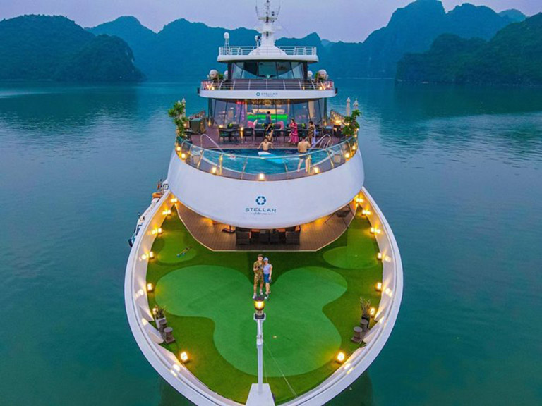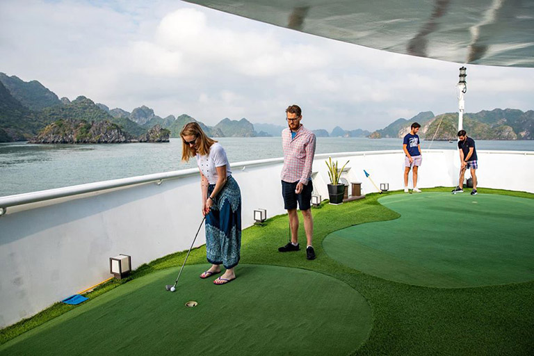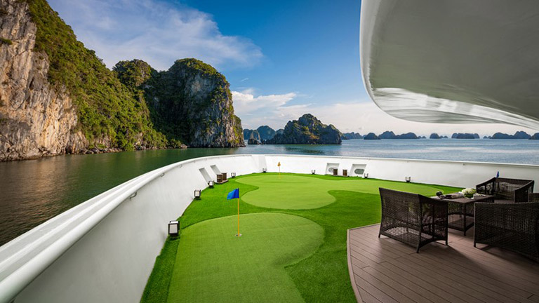 Sân golf mini là tiện ích độc đáo trên du thuyền Stellar of the Sea giúp chuyến nghỉ dưỡng của bạn trở nên thú vị hơn. Sân golf có sân cỏ xanh mượt như thật tại khu vực tầng 2 của mũi tàu, thiết kế gồm 3 lỗ riêng và trang bị đầy đủ tiện nghi.