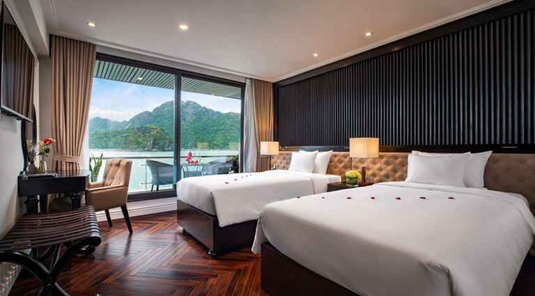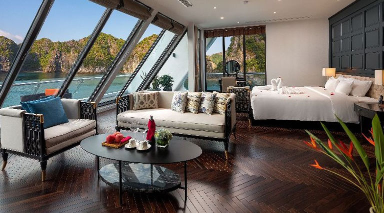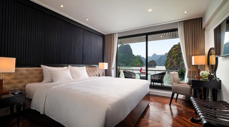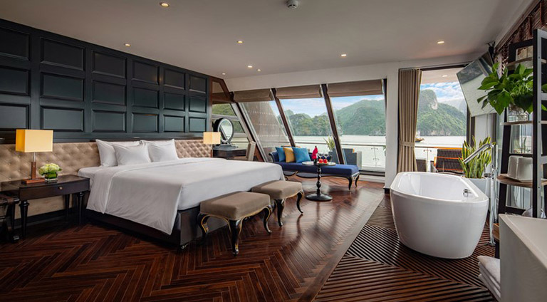 – Hạng phòng Junior Suite: Diện tích khoảng 28m2, gồm 11 phòng với ban công riêng biệt. Sức chứa tối đa 2 người + kê thêm giường phụ. Các phòng Suite Junior được sắp xếp ở vị trí boong đầu tiên, cửa sổ bằng kính trong suốt, ban công rộng mở. Bên trong có đầy đủ các thiết bị như TV, minibar, bàn trang điểm, phòng tắm được lát bằng đá cẩm thạch vô cùng sang trọng.