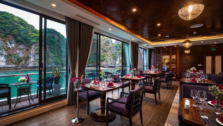 Nhà hàng trên du thuyền được thiết kế sang trọng bao gồm cả không gian bên trong nhà và ngoài trời. Bàn ghế cũng bày trí tinh tế ở mọi vị trí nên bạn thoải mái ngắm cảnh vịnh. Bên cạnh đó, du khách được thưởng thức những món ăn siêu hấp dẫn từ châu Á đến châu Âu, do đầu bếp tài hoa thực hiện.