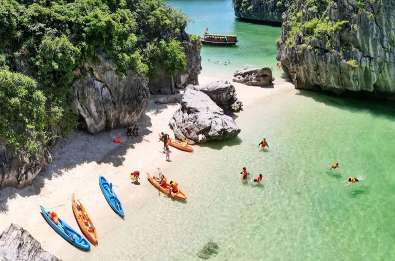 – 07h30: Quý khách di chuyển đến khu vực hang Sáng Tối bằng cách đi thuyền nan của người dân địa phương hoặc chèo thuyền kayak. Bạn khám phá hệ thống núi đá vôi trong khu vực lõi của vịnh Lan Hạ, xung quanh có cây xanh, nước biển trong veo.