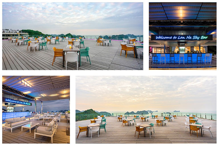 Lan Hạ Sky Bar cũng là một trong những nơi có tầm view đẹp nhất ngắm trọn vịnh Lan Hạ. Đến nơi đây, du khách thưởng thức ngay các loại đồ uống pha chế, rượu mạnh hoặc cocktail ấn tượng. Giờ mở cửa: Từ 11h- 23h30. Sức chứa: 200 khách.