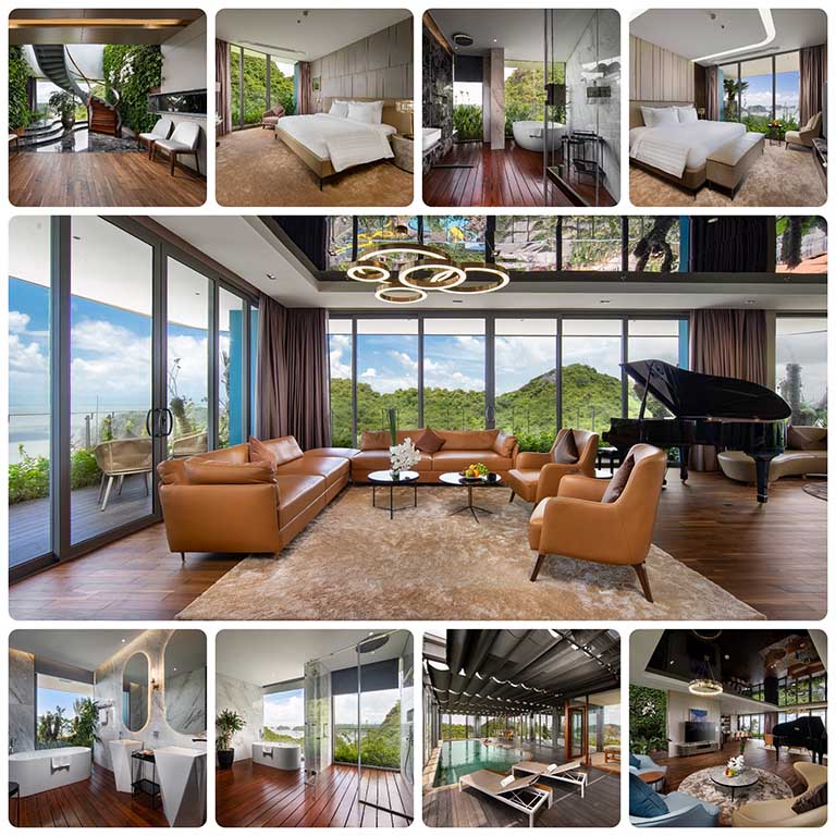 – Imperial Suite: Diện tích 628m2, toạ lạc tại vị trí hoàng kim của Flamingo Cát Bà Beach Resort, tỏa mình giữa miền sơn thủy, biệt thự tổng thống Emperial Suite sở hữu 3 mặt hưởng trọn vẻ đẹp của vịnh Lan Hạ.