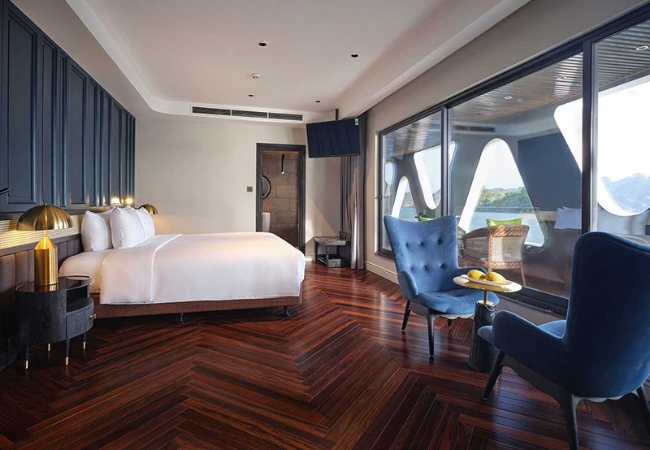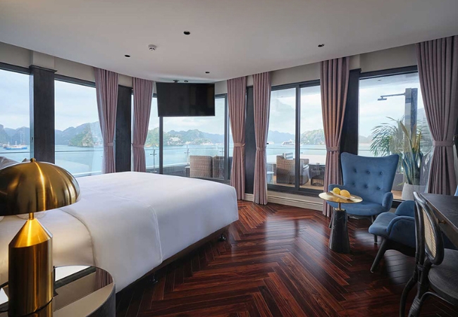 Sở hữu ban công riêng và tầm nhìn panoramic view bao quát toàn vịnh. Phòng dành cho 2 người lớn và 1 trẻ em dưới 4 tuổi, có thể chọn giường queen hoặc 2 giường đơn. Đây là hạng phòng cao cấp nhất, mang lại trải nghiệm nghỉ dưỡng riêng tư, sang trọng và đẳng cấp.