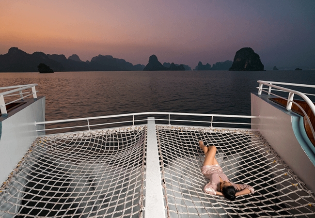 - 15h30: Tham gia bữa tiệc hoàng hôn được tổ chức trên sundeck của du thuyền Catamaran Cát Bà sang trọng. Những ly nước mát lạnh, hoa quả tươi ngon, bánh ngọt thơm phức hấp dẫn được phục vụ chu đáo. Trà thơm, cafe đậm đà cùng view hoàng hôn buông dần trên vịnh thiên đường lãng mạn tuyệt vời.