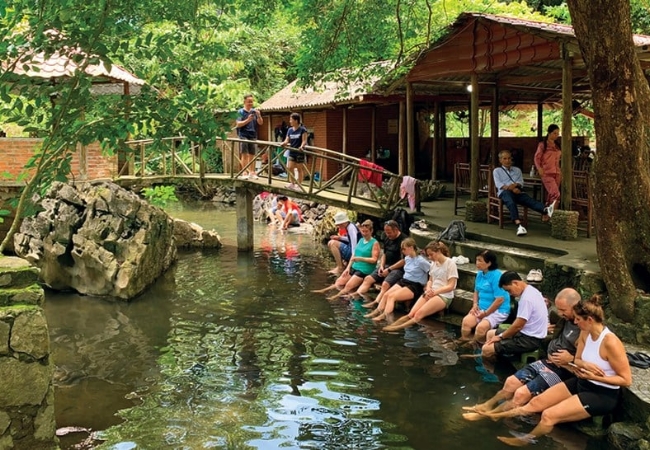Du khách được tự do chụp ảnh với khung cảnh làng mạc yên bình giữa núi rừng thơ mộng. Trải nghiệm dịch vụ cá mát xa chân độc đáo chỉ có ở đây rất thú vị lạ lẫm mới mẻ. Những chú cá nhỏ sẽ cắn nhẹ bàn chân tạo cảm giác dễ chịu giúp thư giãn tuyệt vời.