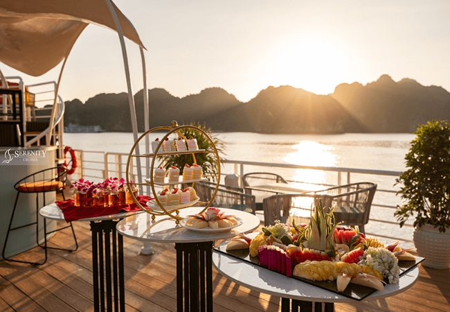 Tiệc hoàng hôn trên sundeck là khoảnh khắc lãng mạn nhất trong hành trình du thuyền Catamaran Cát Bà tuyệt vời. Ngắm mặt trời từ từ lặn xuống chân trời nhuộm vàng cả một vùng trời nước bao la mênh mông. Nhâm nhi cafe, trà thơm cùng hoa quả tươi ngon, bánh ngọt trong không khí mát mẻ dễ chịu vô cùng.