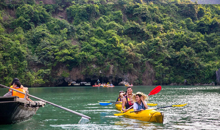 – 12h00: Quý khách di chuyển đến hang Tối và hang Sáng sát vịnh Hạ Long. Sau đó, bạn sẽ chèo thuyền kayak 2 chỗ qua những khe hẹp của dãy núi để ngắm nhìn bên trong các hang động.