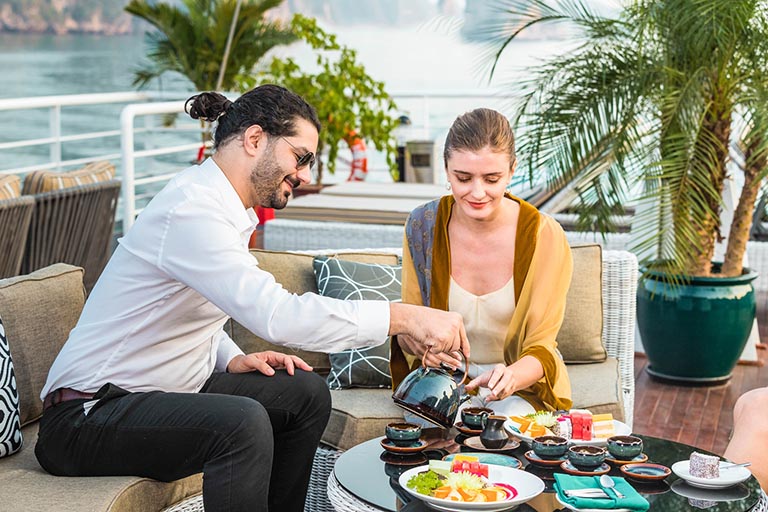 Tiệc trà chiều tổ chức trên sân thượng chính là lời tri ân của chúng tôi dành cho tất cả Quý khách hàng trước khi kết thúc hải trình. Không còn gì tuyệt vời và lãng mạn bằng việc cùng người thân yêu thưởng thức một tách trà thượng hạng, nhấm nháp một chiếc bánh thơm ngon và ngắm nhìn khoảnh khắc hoàng hôn đẹp nhất trong ngày tại sân thượng của du thuyền Catamaran.