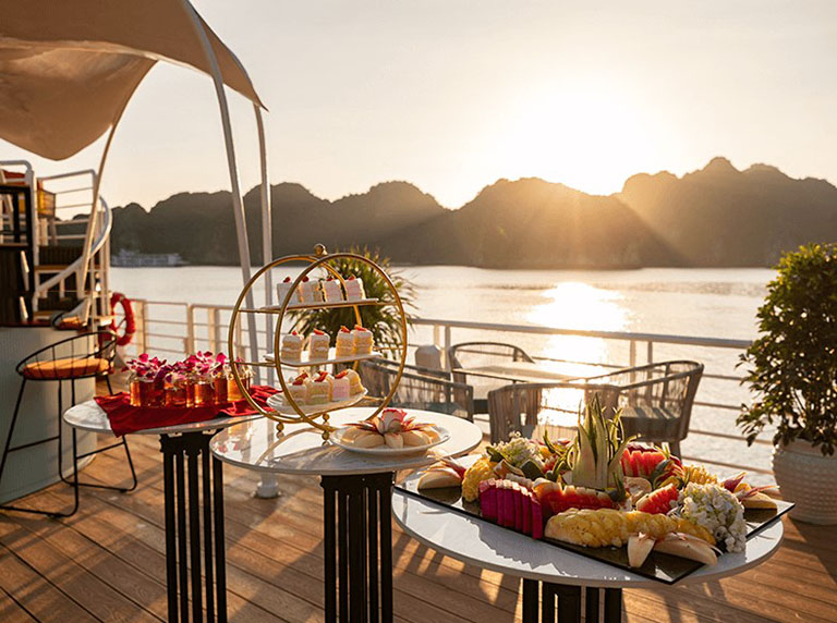 Ngắm mặt trời lặn trên du thuyền và thưởng thức bữa trà chiều đầy lãng mạn chính là một phần trải nghiệm đáng nhớ trên Tour du thuyền Catamaran 5… -