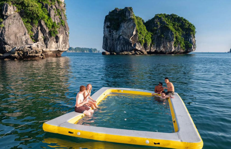 – 15h00: Du thuyền dừng lại tại khu vực biển lặng giữa vịnh biển. Bạn tham gia ngay vào các hoạt động như bơi lội, nhảy tàu từ trên cao xuống, thử cảm giác mạnh với cầu trượt dài nhất vịnh Lan Hạ, bể bơi phao khí, chèo thuyền kayak,…