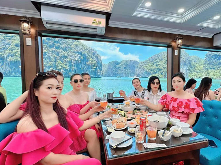 – 17h30: Quý khách tham gia tiệc trà ánh hoàng hôn lãng mạn, giữa khung cảnh tuyệt vời trên vịnh Lan Hạ. Đây chắc chắn là quãng thời gian khó quên nhất.